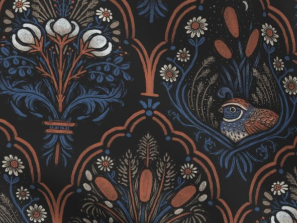 Ever since I fell in love with creating two-toned damask patterns, I've been expanding my collection with whimsical, elevated novelty motifs. I hand-painted the vertical grasscloth texture and all the antique patina. This has to be my most detailed damask I've painted yet. I couldn't resist seeing if I could capture the water's surface in just two values.